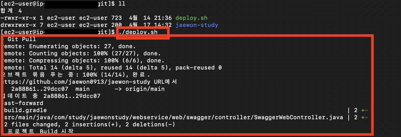 - Push가 정상적으로 진행되었다면, 쉘 스크립트를 실행합니다.