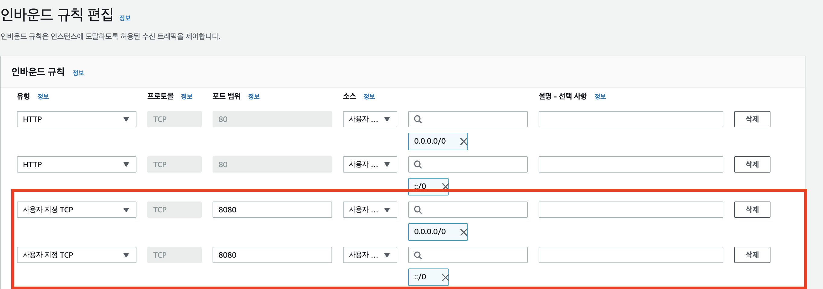 - 사용자지정(TCP) -> 8080 포트를 추가합니다.