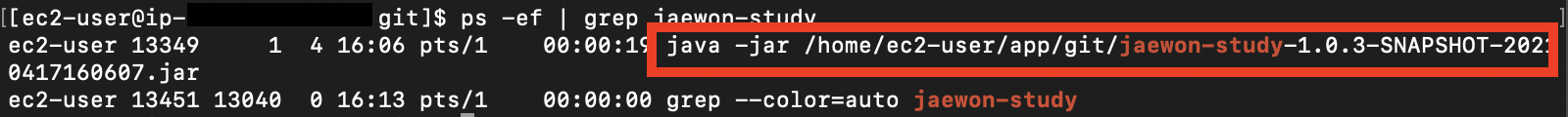 ps -ef|grep 프로젝트명 (ex :ps -ef|grep jaewon-study)