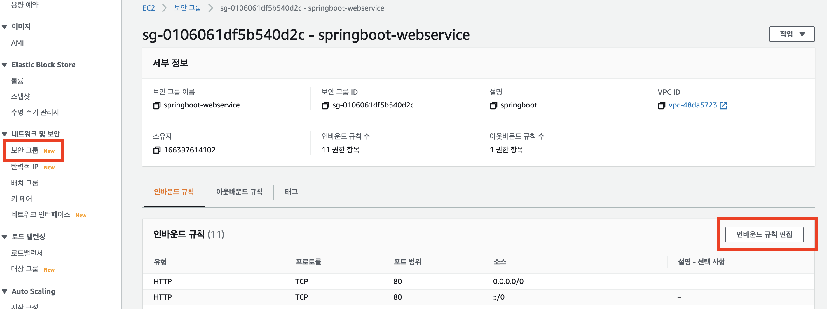 - AWS -> EC2 -> 보안 그룹 -> EC2에 할당한 보안그룹 -> 인바운드규칙 -> 인바운드 규칙 편집 클릭