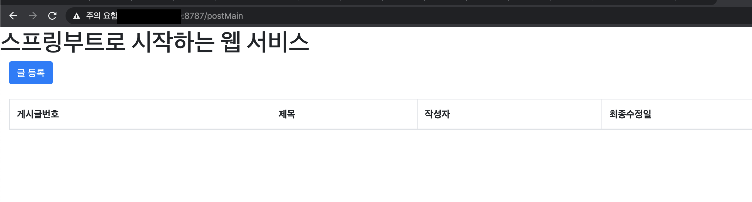 - 스프링부트가 8080 포트로 열려있으므로, 해당 주소에 8080포트를 붙여서 접속합니다.(ex : 주소:8080)