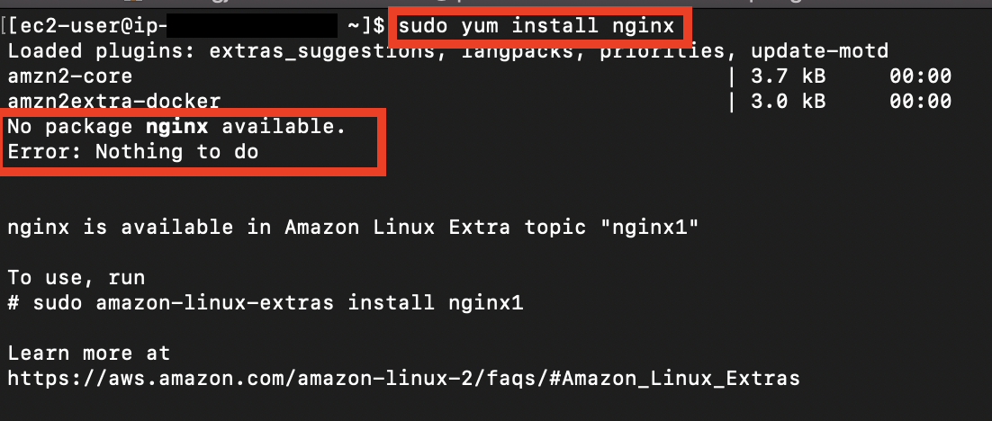 - 만약, 아래의 이미지와 같이 nginx package가 없다는 메시지를 받거나, 실패한다면 3-1를 진행하여 설치합니다.