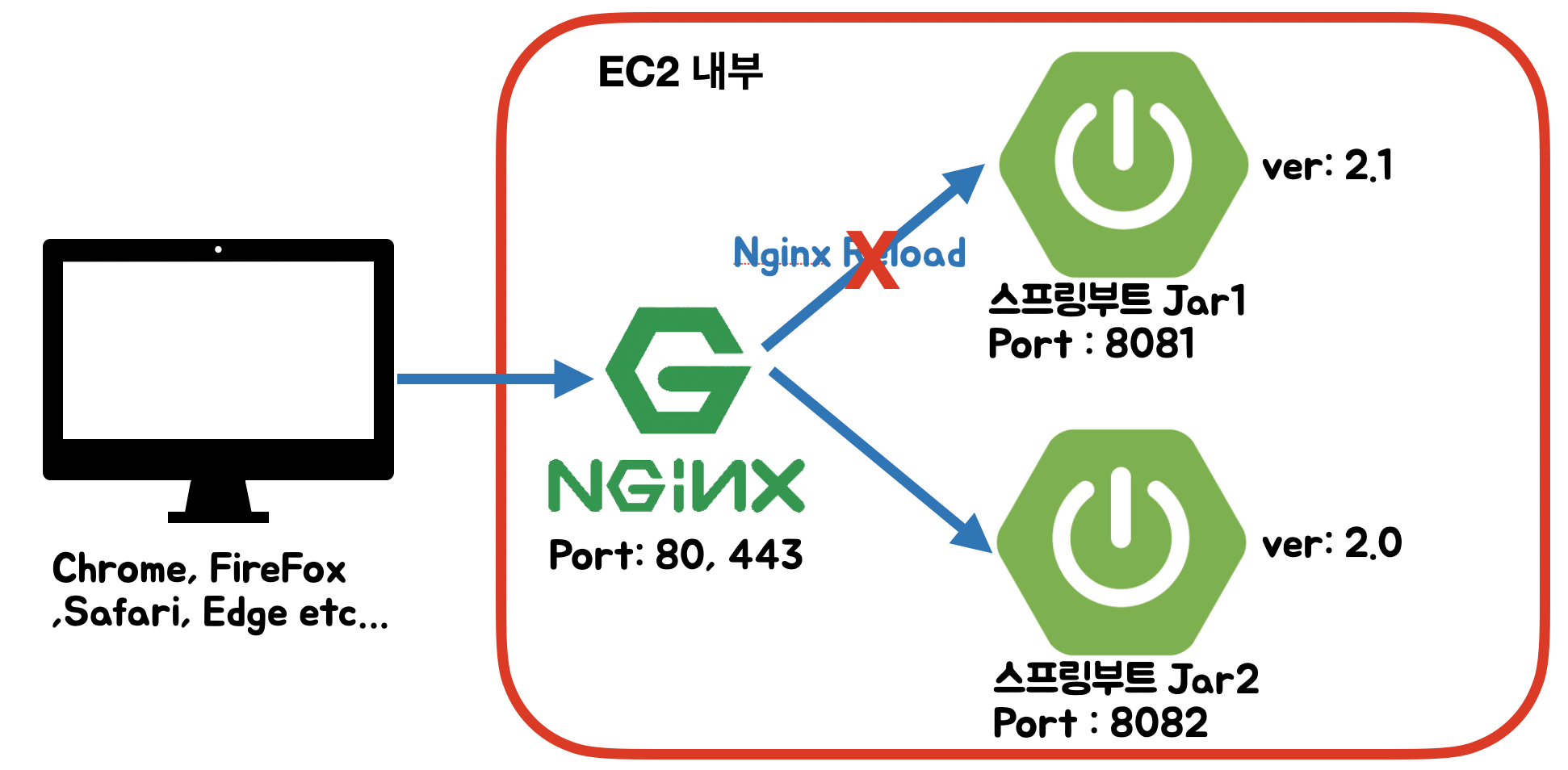 - 배포 도중 문제가 생겼다면, nginx는 그대로 스프링부트 Jar2(8082)를 바라보도록 합니다.