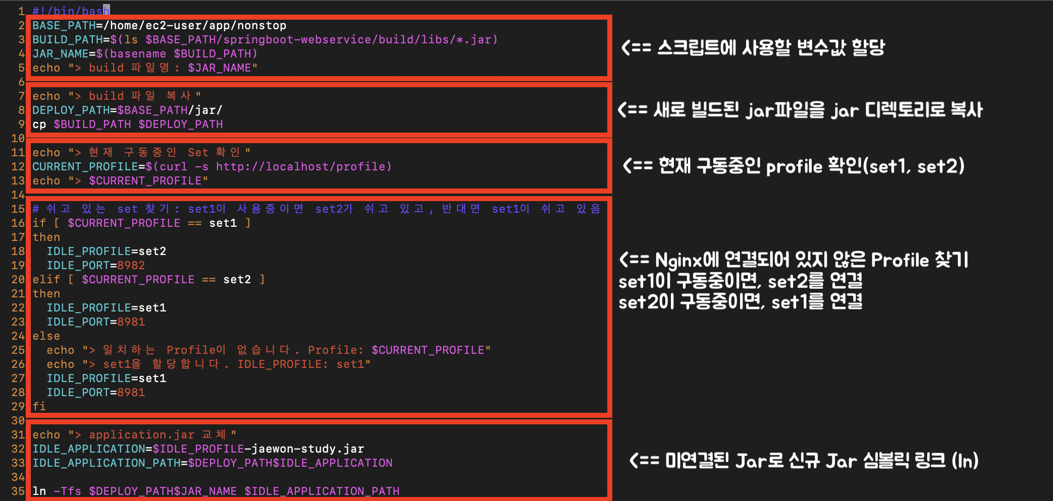 - 동적 프록시 환경이 구축된 Nginx을 배포 시점에 바라보는 Profile을 자동으로 변경하는 스위치(switch) 스크립트를 생성하겠습니다.