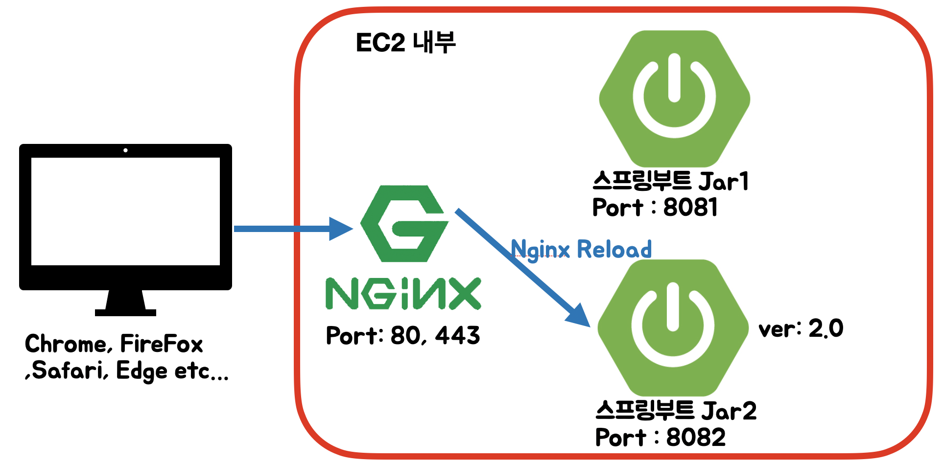 - 2.0 버전으로 신규 배포가 진행되면 현재 동작중이지 않은 스프링부트 Jar2(8082)로 배포합니다.