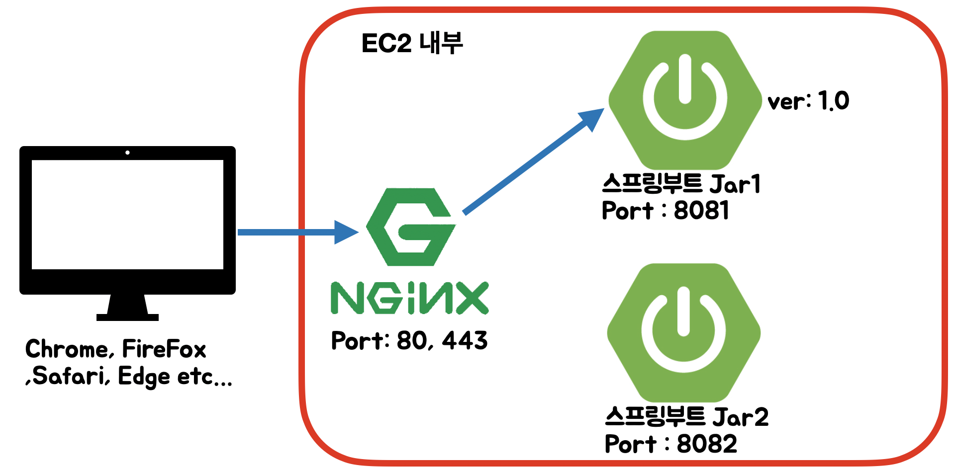- 사용하고 있는 EC2 서버에 Nginx 1대와 스프링부트 jar 2대를 사용하겠습니다.
