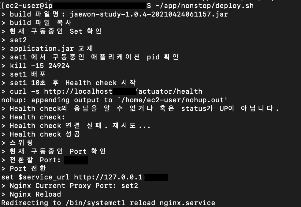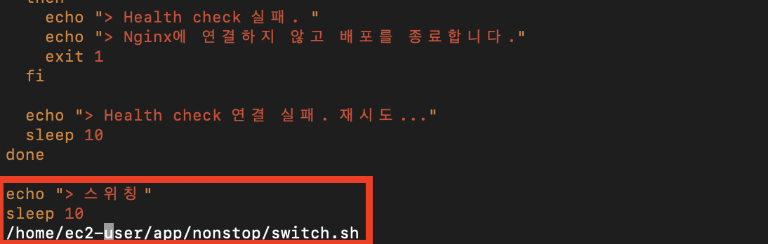 - 정상적으로 반환되는지 확인이 되면, deploy.sh와 switch.sh를 합쳐 deploy.sh가 실행되면 다음으로 switch.sh가 자동으로 실행되도록 수정하도록 하겠습니다.
