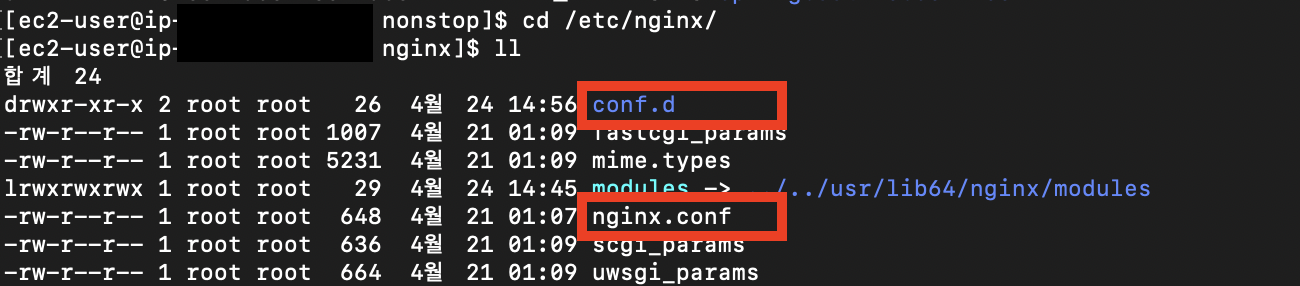 - /etc/nginx 디렉토리가 Nginx 설정에 관련된 디렉토리입니다.