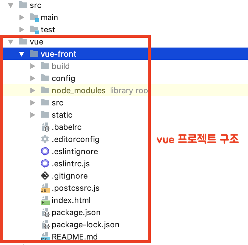 - 우측 이미지는 SpringBoot 프로젝트 내에서 Vue 프로젝트를 따로 생성한 이미지입니다.