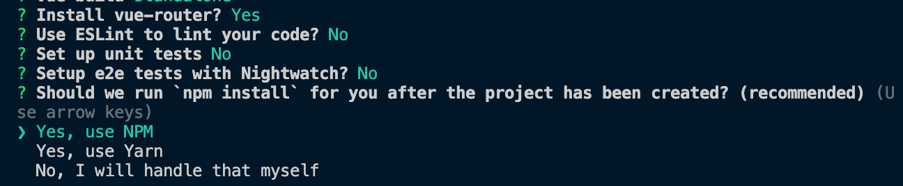 - Install vue-router : 라우터 설치(라우터를 사용하고자 하면 Y 를 선택합니다.)