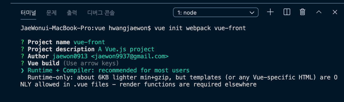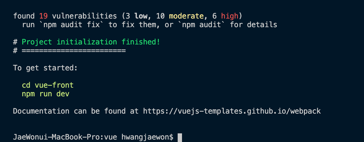 - 아래 명령어를 통해 디렉토리에 vue 프로젝트를 생성합니다.