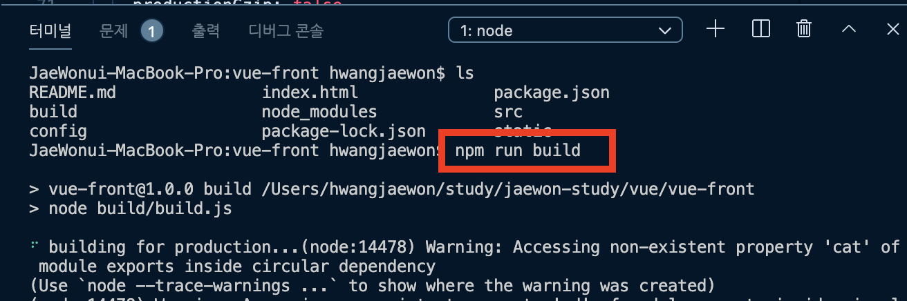 - VS Code 내 vue 프로젝트에서 아래 명령어를 통해 빌드(Build)를 진행합니다.