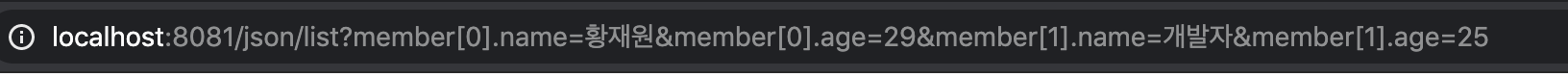 - http://localhost:8081/json/list?member[0].name=황재원&member[0].age=29&member[1].name=개발자&member[1].age=25