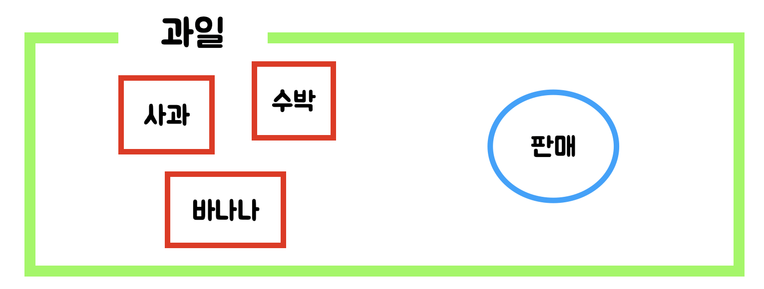 - 위의 그림을 예로 들어보면 "과일"이란 Class 는, "사과, 수박, 바나나"라는 필드(변수)가 있으며, "판매"라는 메소드로 구성되어 있다.