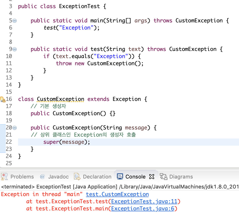 - 기존에 정의된 예외 클래스 외에 개발자의 필요에 따라 새로운(커스텀) 예외를 정의 가능.