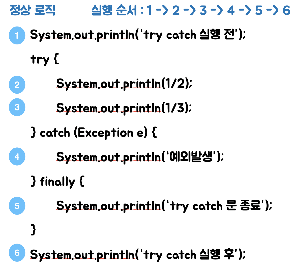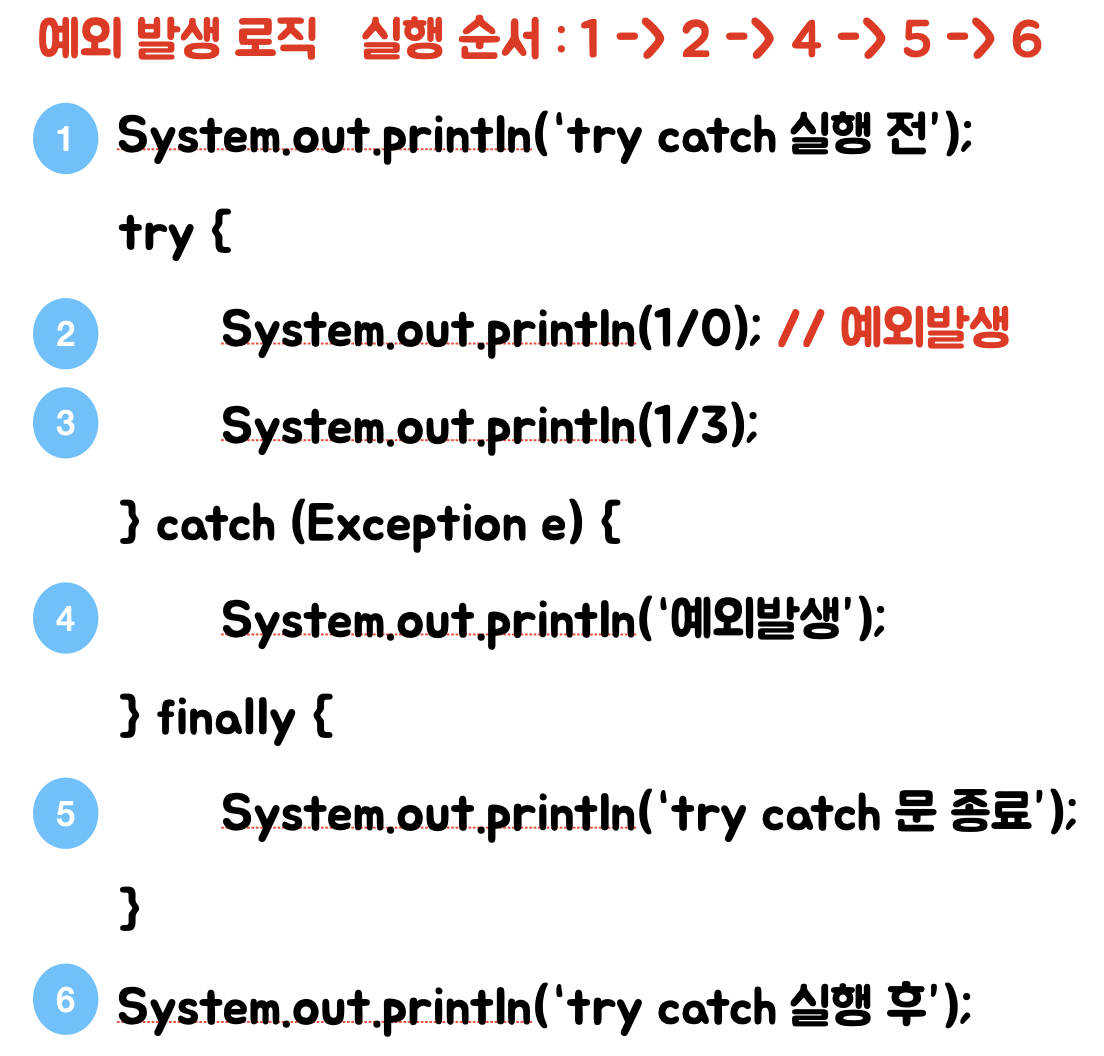 - try 블록에서 예외가 발생한다면, catch 블록으로 넘어가 코드를 실행 후, finally 블록 코드 실행.