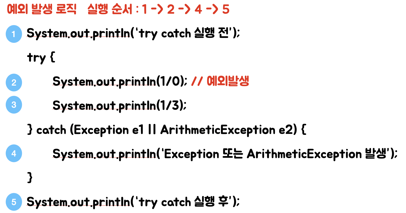 - 우측은 하위 예외클래스인 ArithmeticException가 먼저 있기 때문에 실행이되며 이후 Exception 블록은 실행되지 않는다.(하지만 try 블록에서 ArithmeticException이 아닌 다른 예외 발생시 Exception 블록이 실행될 것이다.)