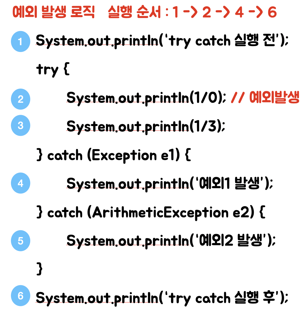 - 예외 발생 시 하나의 catch 블록에 걸리게 된다면 이후 catch 블록은 실행하지 않는다.