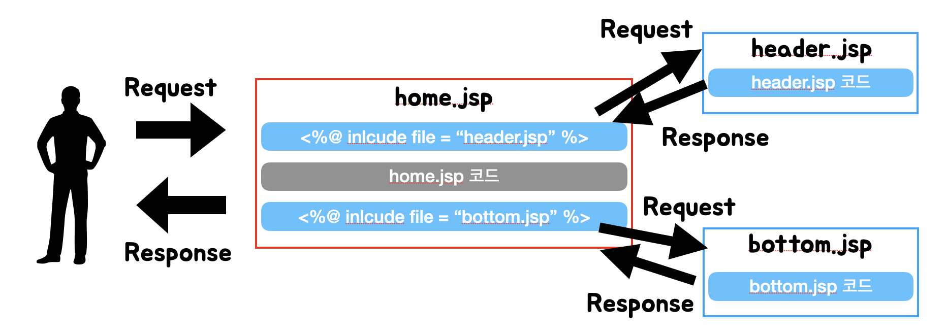 - 페이지가 request 될 때 , 포함할 jsp 페이지를 다시 request를 하는 과정을 가진다.