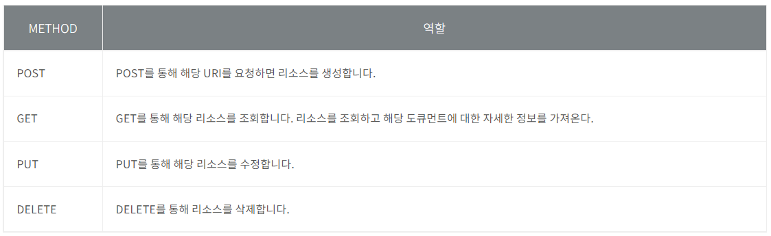 - CRUD 연산에 대한 요청을 할 때, HTTP URI(Resource)를 통해 자원을 명시하고, HTTP Method(Get, Post, Put, Delete)를 통해 수행한다.