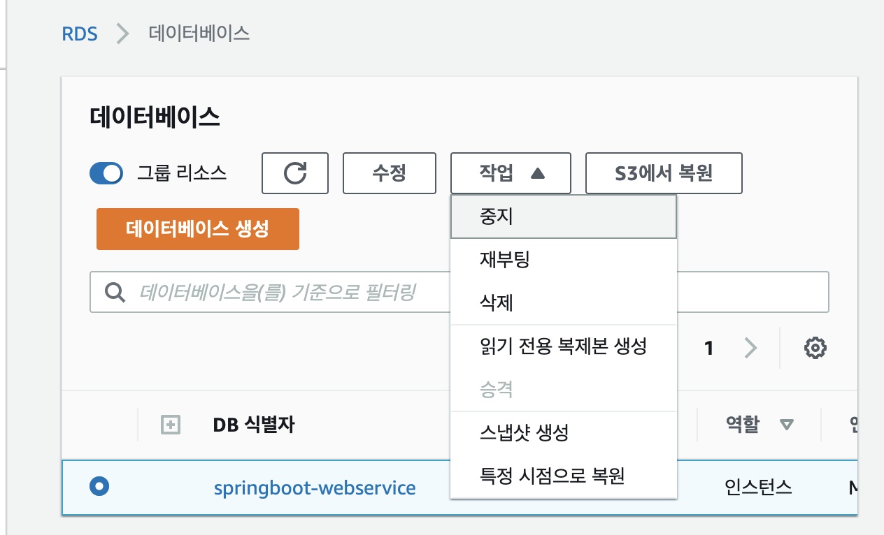 - EC2 인스턴스 중지와 동일하게 RDS 중지를 먼저 진행 후, 삭제를 진행한다.