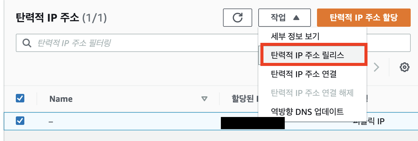 - [탄력적 IP] -> [작업] -> [탄력적 IP 주소 릴리스] 를 선택한다.
