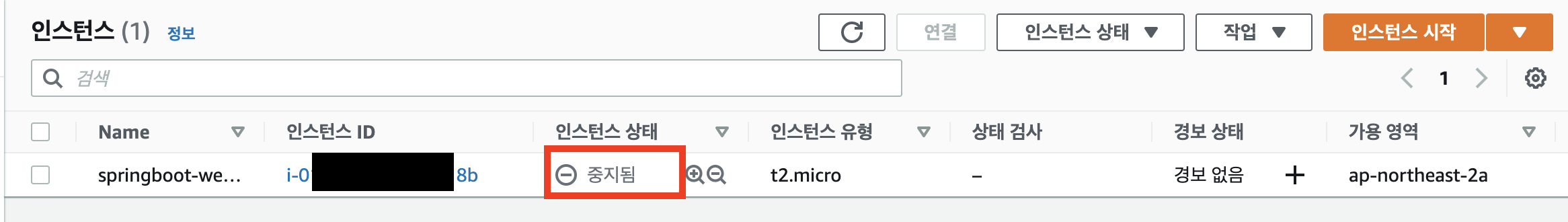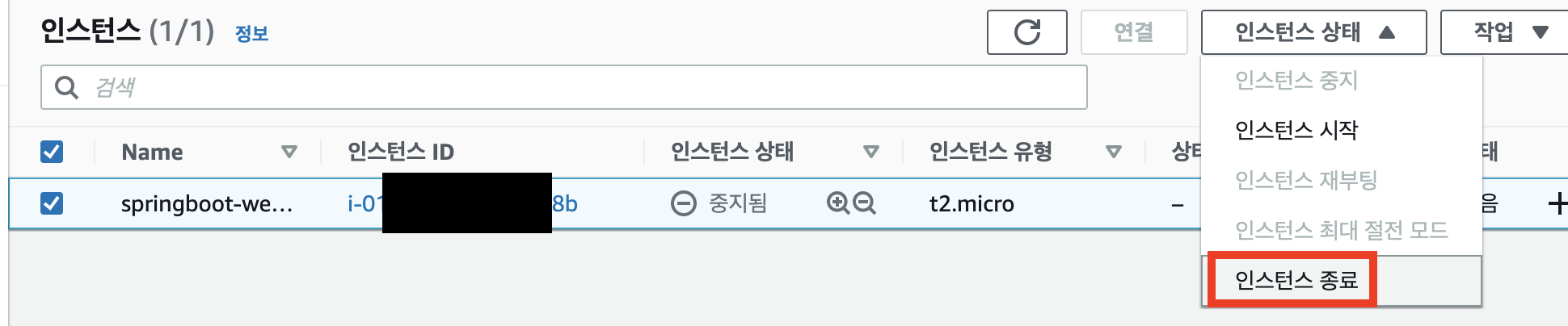 - 인스턴스가 중지되었다면, [인스턴스 상태] -> [인스턴스 종료] 를 선택한다.