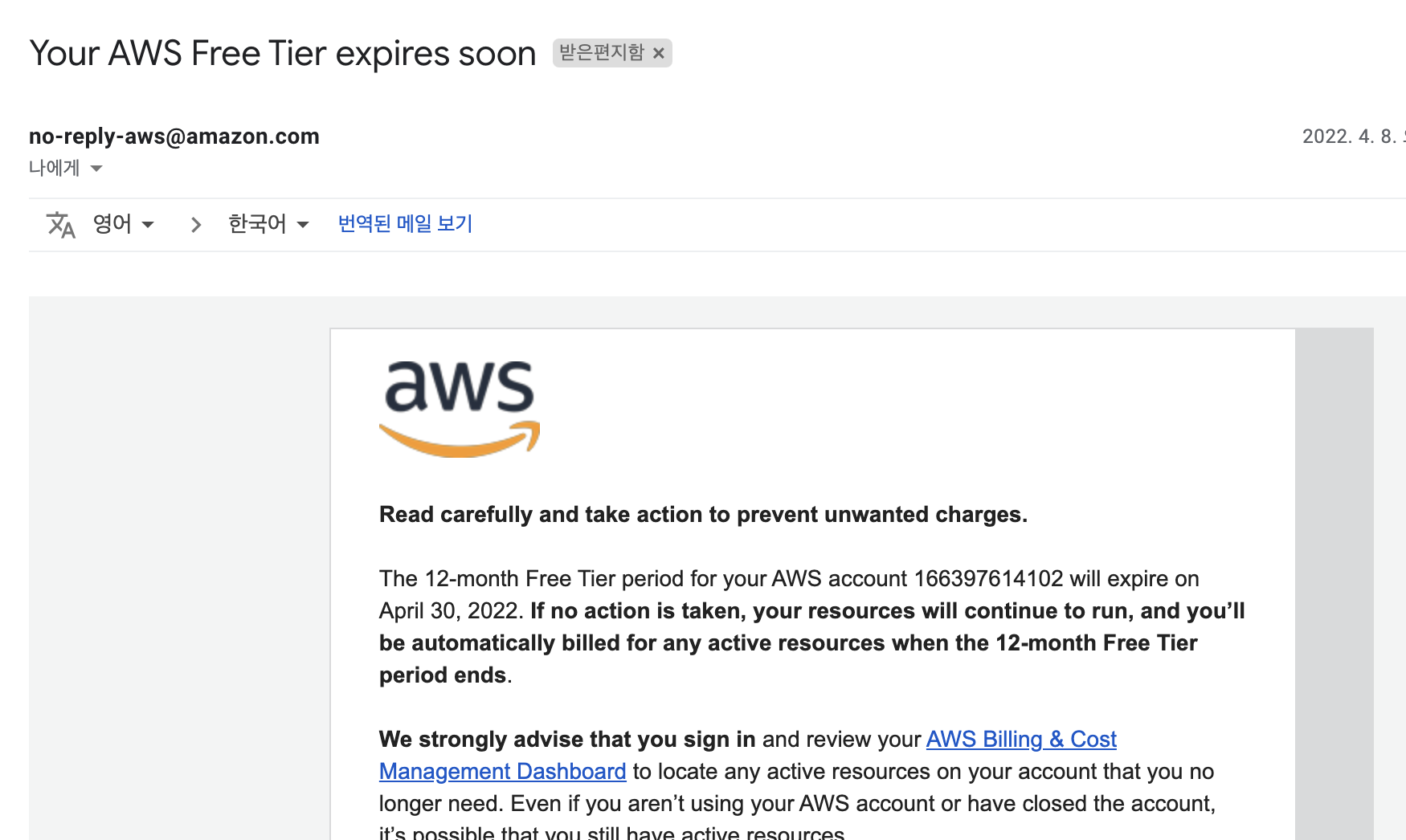 - AWS에서 프리티어가 종료할 날짜가 되면, 아래와 같이 메일이 온다.