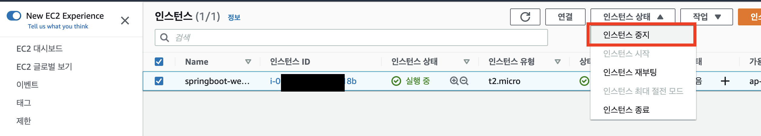 - 가장 먼저 요금이 많이 과금이 될 EC2(인스턴스) 서버를 중지시킨다.