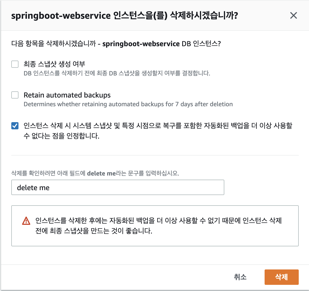- 계속해서 사용하지 않을 것이기 때문에, 최종 스냅샷 생성 여부와 같은 것은 체크하지 않고, 삭제를 진행한다.