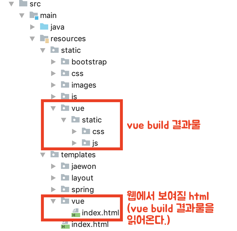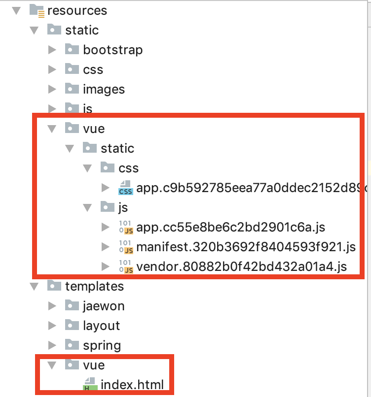 - 좌측 이미지는 위 Vue 프로젝트를 build 할 때 SpringBoot 프로젝트 구조 이미지입니다.