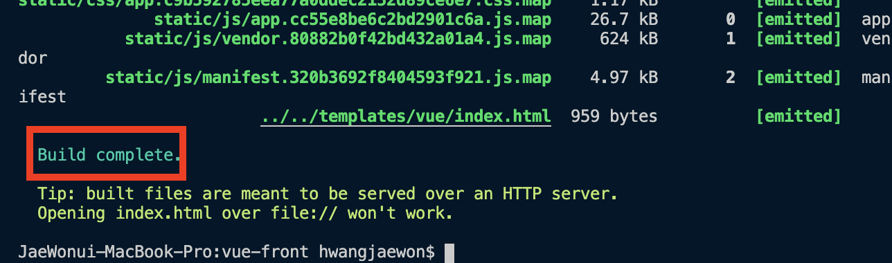 - VS Code 내 vue 프로젝트에서 아래 명령어를 통해 빌드(Build)를 진행합니다.